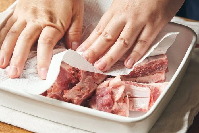 お肉の下処理をしたらバットに入れて、水気を抑えるように拭き取ります。