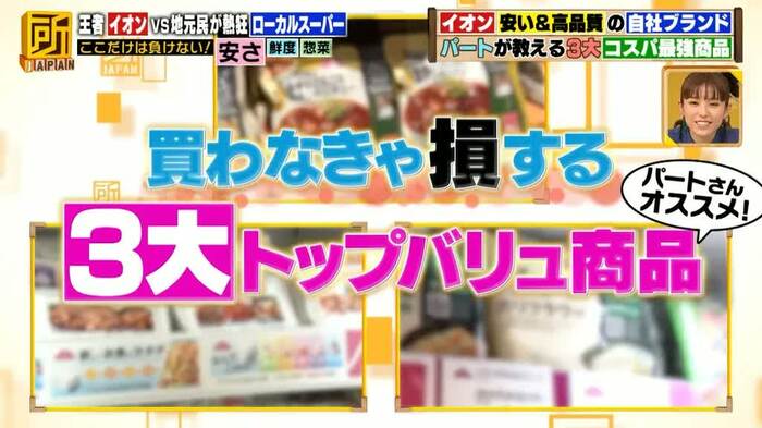 そこで番組では、イオンで働くパートのみなさんに「仕事終わりに買ってしまう商品は?」と質問。パートさんオススメの“買わなきゃ損する3大トップバリュ商品”を紹介しました。