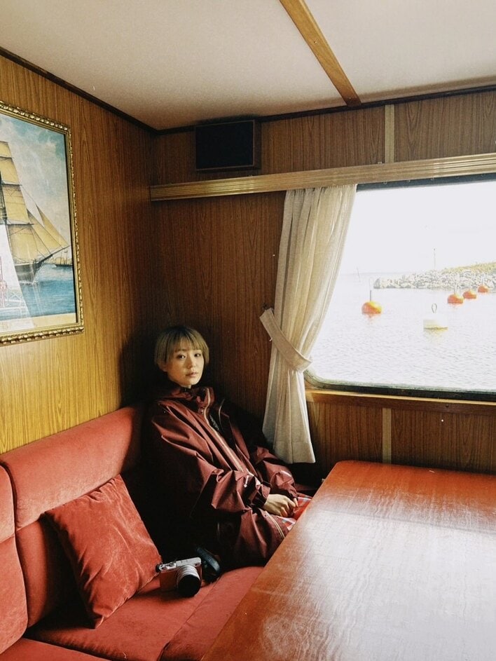 そこには、海が見える窓際で、赤いソファに座り、じっとこちらを見つめる奈緒さんの姿が!