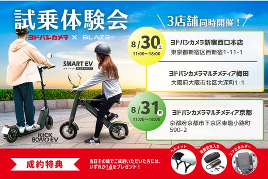 株式会社ブレイズ(愛知県名古屋市、代表取締役:市川秀幸、以下ブレイズ)は、2025年8月30日(土)・31日(日)の2日間、ヨドバシカメラ関東・関西の3店舗にて「スマートEV 特定原付モデル」「キックボードEV ライトモデル」の試乗体験会を、初めて同時開催いたします。
