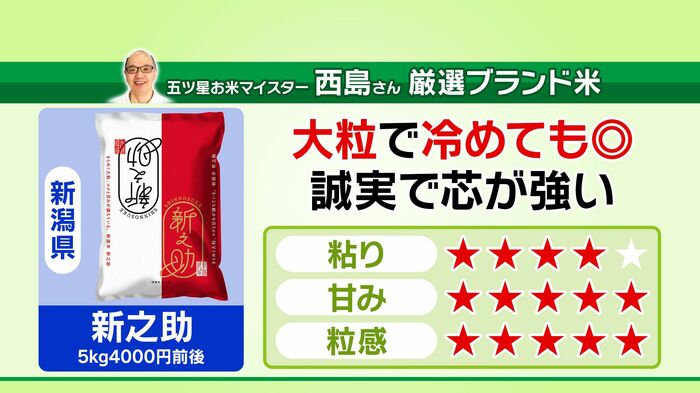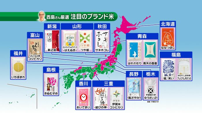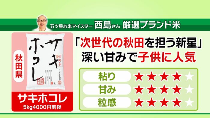 注目のブランド米を紹介しながら、「ブランド米は品質が担保されているから、知らない品種でも買ってみて欲しい。例えば宮城のブランド米『だて正夢』は粘り気が多いので朝食には少し重い、など、ブランドによって本当に味が違う」と語った西島さん。スタジオでは秋田のブランド米「サキホコレ」と、新潟の「新之助」を食べ比べました。
