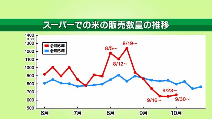 まずは今年8月のスーパーでのお米の販売数を振り返り。南海トラフ地震や台風への備えから夏場にお米の販売数が急増し、その後の米不足につながりました。