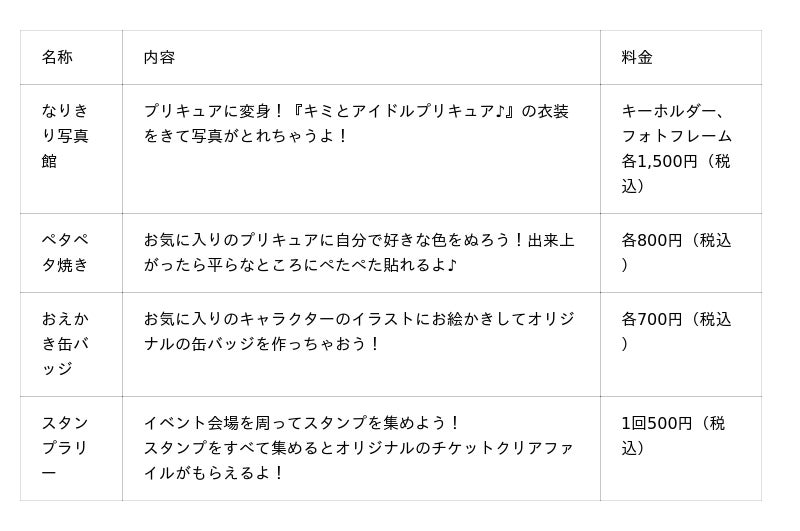 本イベントは、ABCテレビ・テレビ朝日系列にて毎週日曜日の朝8時半より放送中の大人気シリーズ『キミとアイドルプリキュア♪』の体験型テーマイベントです。イベント期間中は、毎日プリキュアに会えるステージを開催します。また、『キミとアイドルプリキュア♪』に登場する主人公「うた」が住む「はなみちタウン」の世界観を楽しめるツールやフォトスポット、プリキュアに変身して様々なレッスンに挑戦したり、チョッキリ団が召喚するモンスター「マックランダー」と戦ったりするツールが登場します。さらに、毎年大好評のプリキュアの衣装を着て写真が撮れる「なりきり写真館」やオリジナル缶バッジが作れる「おえかき缶バッジ」などのワークショップも登場します。