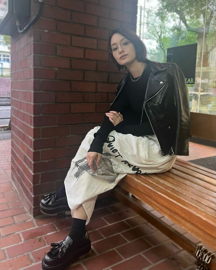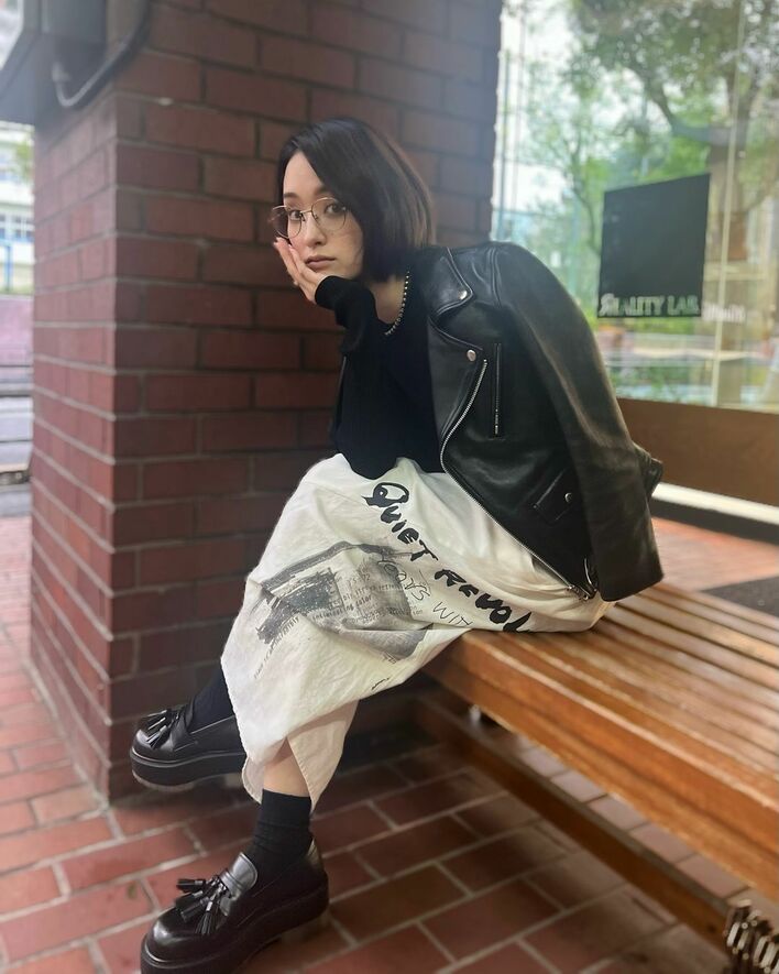 黒のダブルライダースジャケットが肩掛けされていて、こなれ感のあるおしゃれな着こなしがされています。