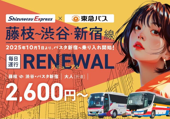 しずてつジャストライン株式会社(本社:静岡県静岡市葵区、代表取締役社長:田中 尚弘)と東急バス株式会社(本社:東京都目黒区、取締役社長:古川 卓)、が共同運行する高速乗合バス「藤枝~渋谷線」は、2025年10月1日(水)より、国内最大級の高速バスターミナルであるバスタ新宿まで延伸し、乗換なしの約3時間40分で結びます。また、運行本数を毎日2往復へ増便し、これにより、藤枝エリアから渋谷・新宿への移動がより便利になります。