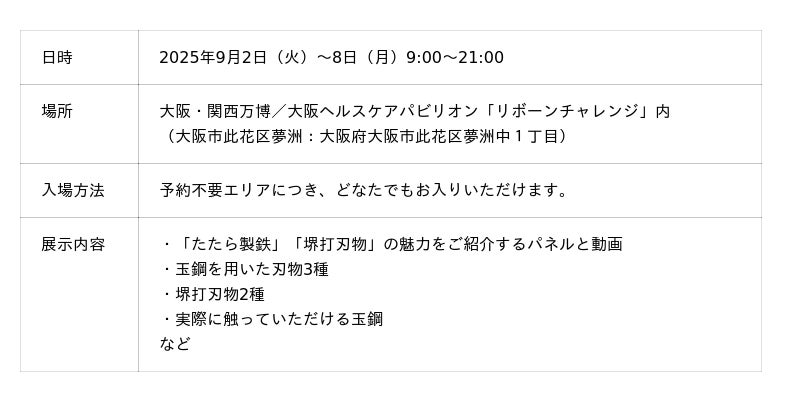 会場では、和鋼ができるまでの工程や、「たたら製鉄」「堺打刃物」の伝統技術と魅力をご紹介します。日本刀の製作には欠かせない玉鋼と玉鋼を用いた柳刃包丁の展示もご用意しています。