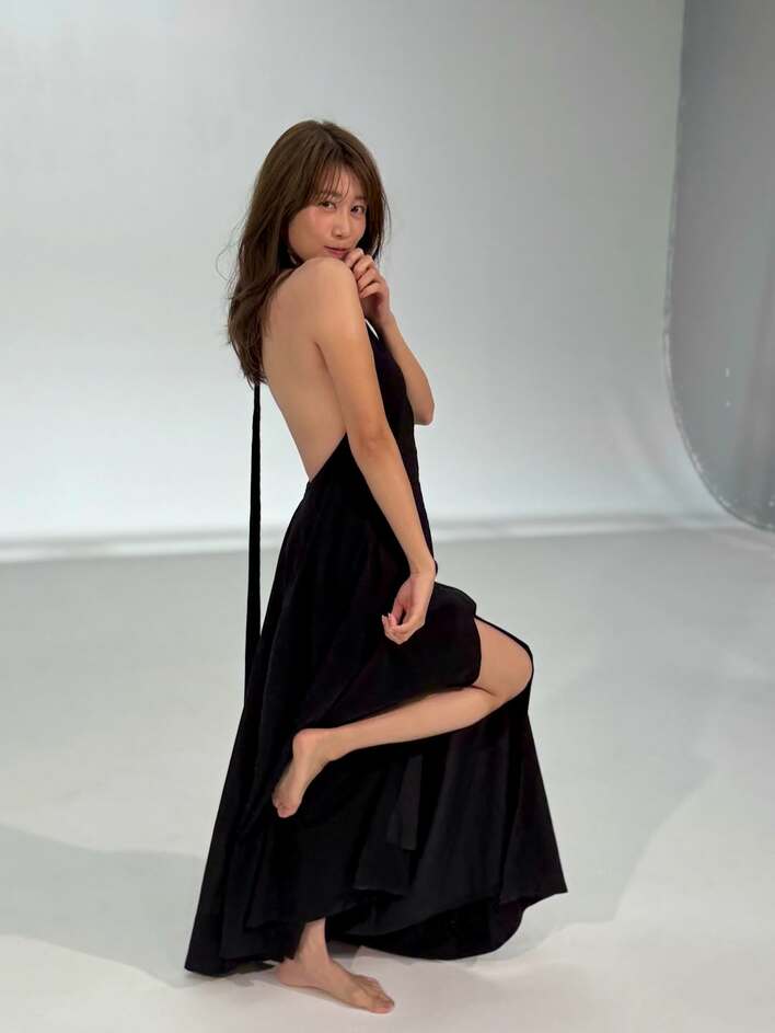 背中が大きく開いたドレッシーな黒のワンピースを纏った中川さんは、片足を上げ可愛らしくポージング。スカートから伸びる美脚が際立つショットを見せたり…