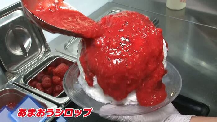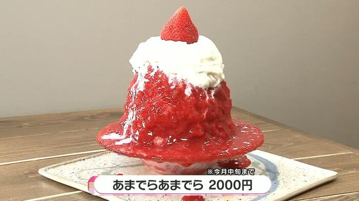 このお店で人気なのが、あまおう5個を乗せたかき氷の上に、あまおうを17個分使用した特製いちごシロップをたっぷりかけた「あまでらあまでら」。
