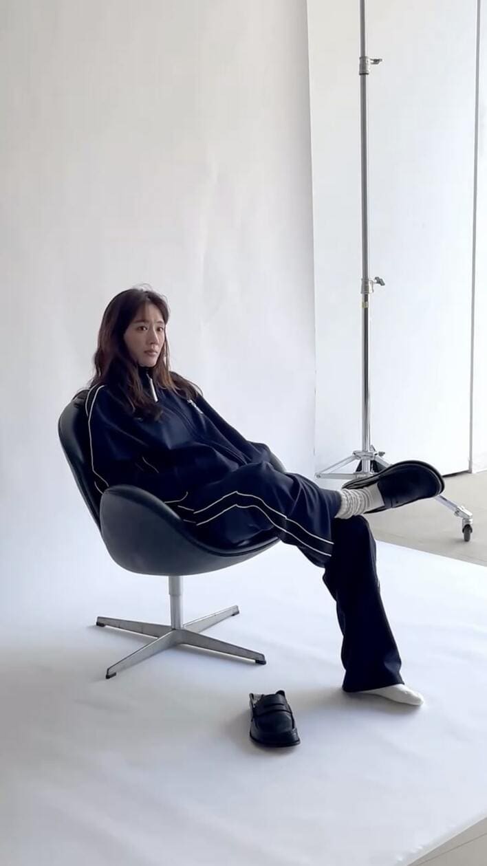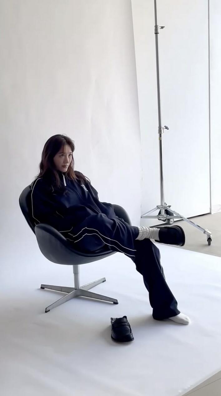 今回の投稿で「撮影中に、、、綾瀬はるかがメンズウェアを着る!」とつづり、撮影の合間にリラックスする姿が公開されています。