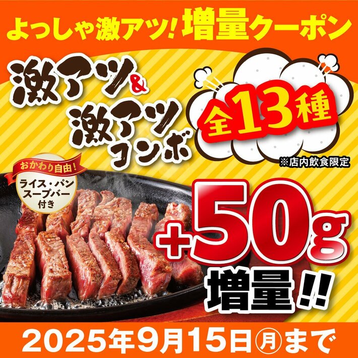 対象の「激アツステーキ」「激アツコンボ」メニューをご注文時にクーポンをご利用いただくと、激アツステーキをお値段そのまま50g増量でご提供。