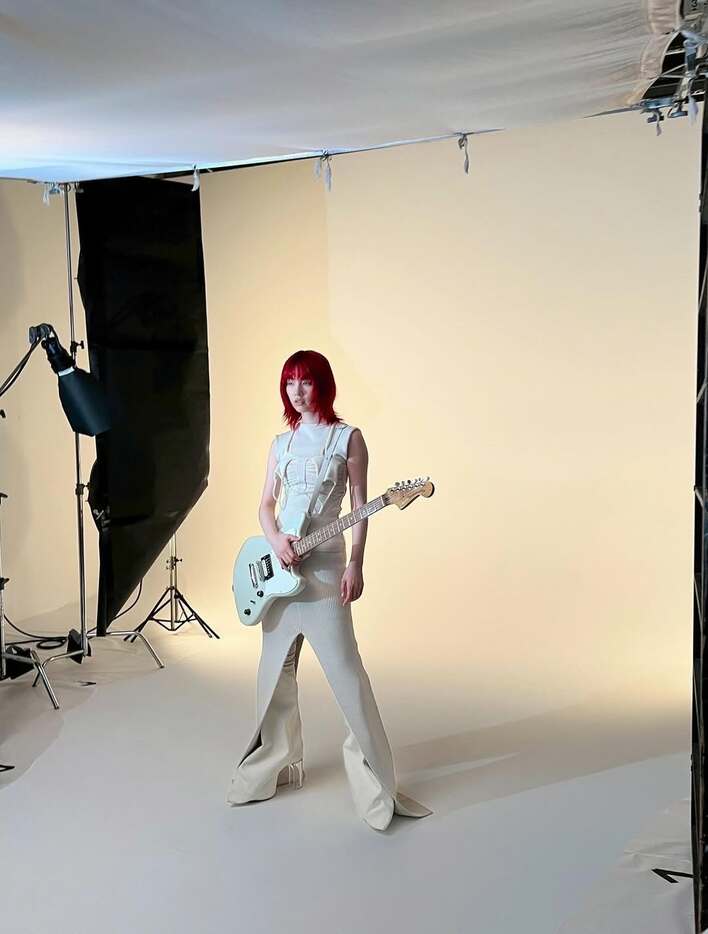 全身ホワイトの衣装に身を包んだのんさんが、白色のギターを持ち、白色の空間にたたずんでいます。写真撮影中と思われるのんさんは、脚を大きく広げ、堂々とポーズを決めています。