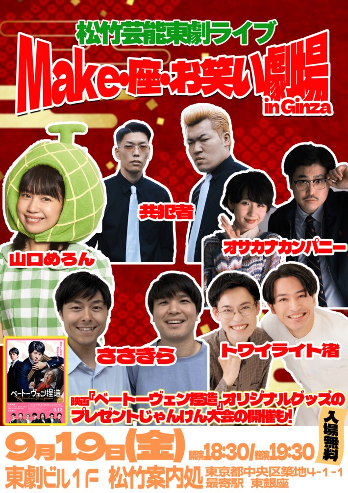 2025年9月19日(金)、松竹芸能が贈る「松竹芸能東劇ライブ~Make・座・お笑い劇場 in Ginza~」を開催いたします。
