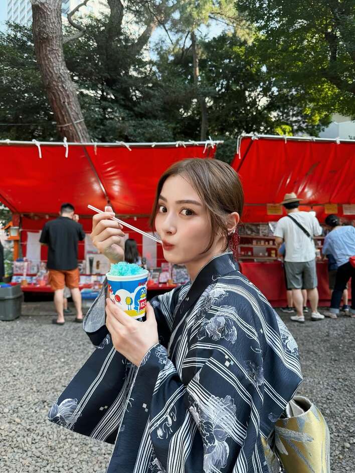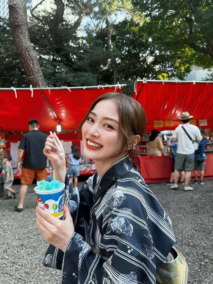 そんなプライベートでの人生初浴衣を着た全身ショットを見てみると、髪の毛を一つにまとめ、黒の浴衣に金と銀の帯を合わせたシックな装いからは、上品な雰囲気があふれています。