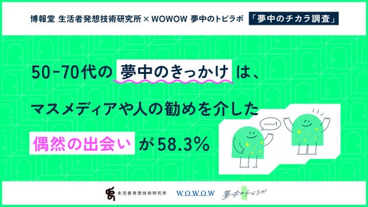 株式会社博報堂(本社:東京都港区、代表取締役社長:名倉健司)の生活者発想のアップデートと活用を推進する「生活者発想技術研究所」と、株式会社WOWOW(本社:東京都港区、代表取締役社長執行役員:山本均)の大人の夢中について探究する「WOWOW 夢中のトビラボ」は、大人が夢中になれるものごとを持つことの可能性(夢中のチカラ)について共同研究を進めています。