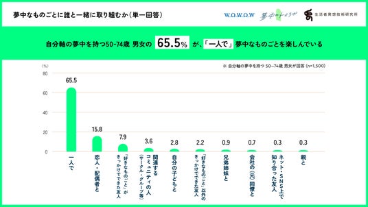 - 自分軸の夢中を持つ50-74歳 男女の65.5%が、「一人で」夢中なものごとを楽しんでいる。