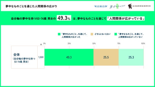 - 自分軸の夢中を持つ50-74歳 男女の49.3%が、夢中なものごとを通じて「人間関係が広がった」と回答。「どちらともいえない(25.5%)」「人間関係は広がっていない(25.3%)」それぞれの約2倍のスコア。