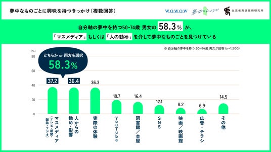 自分軸の夢中を持つ50-70代の58.3 %が、「マスメディア」や「人の勧め」を介した偶然の出会いから夢中なものごとを見つけている