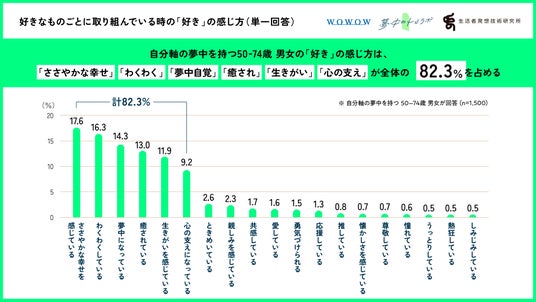 - 自分軸の夢中を持つ50-74歳 男女に、「好きの感じ方」を19種類の項目で聴取したところ、回答は上位6項目「ささやかな幸せ(17.6%)」「わくわく(16.3%)」「夢中自覚(14.3%)」「癒され(13.0%)」「生きがい(11.9%)」「心の支え(9.2%)」に集中し、それらの合計が全体の82.3%を占めた。- それら6項目を、夢中なものごとに向き合っている時の「モード」と捉えて分析したところ、様々な質問項目において、モードごとの傾向の違いが見出された。