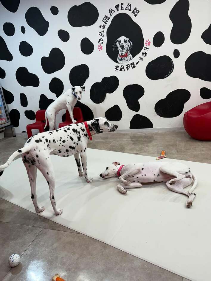 壁がダルメシアン柄になったお店の中には、椅子に足を乗っける子やおなかをゴロンと出して寝転ぶ子が!かなり大きいサイズのように見えますが、「これでも皆10ヵ月のパピーちゃん」なんだとか。