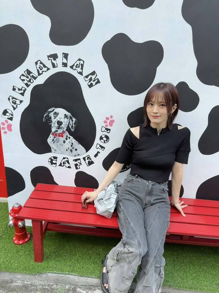 今回の投稿で「先日、ダルメシアンカフェ行ってきました」とつづり、黒のトップスにデニムを合わせたカジュアルコーデで訪れたことを明かした山本さん。