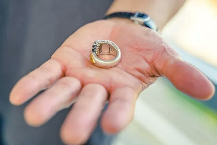 この指輪はクマをモチーフにアイヌ文化を伝承するアーティストが作ったものです。