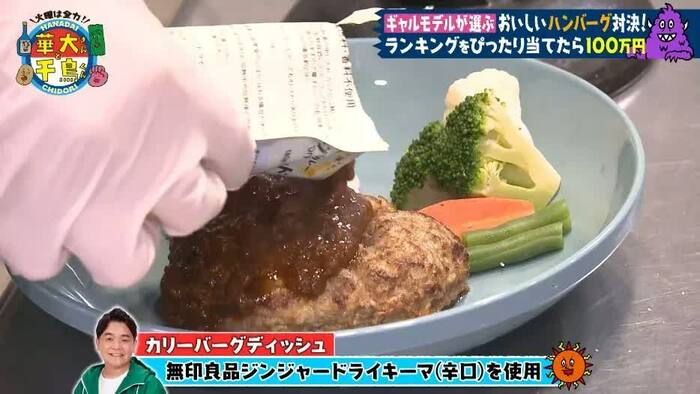 大悟さんからアドバイスされるも、ノブさんは「死ぬほどうまい」と信頼する無印良品のレトルトカレー「ジンジャードライキーマ(辛口)」を味の決め手に。ハンバーグの上にかけて完成させました。