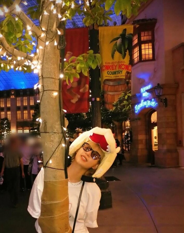 先日、家族とUSJに行ったことを報告すると、サングラスをかけて、木からひょっこり顔を出すおちゃめな姿を公開。