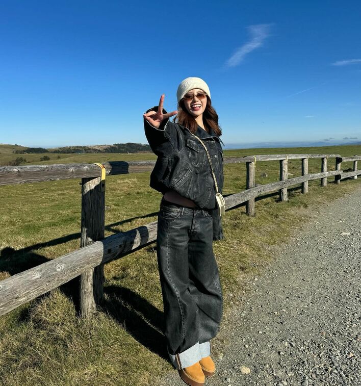 秋らしいコーディネートに身を包み、大自然を楽しむ姿に多くの反響が寄せられています。