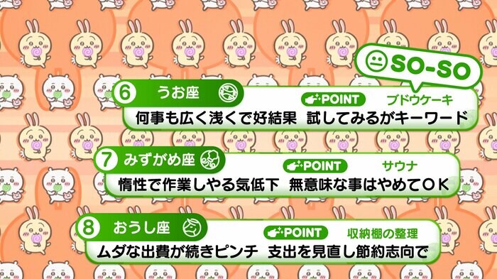 『めざましテレビ』で放送中の「ちいかわ占い」 テレビ放送がない日はお休みで、月~土:朝7時以降に更新予定です。
