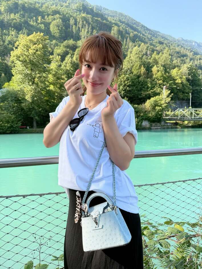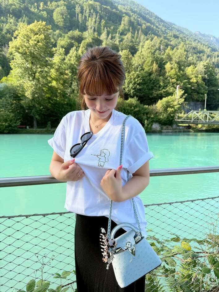 谷さんは「川の水がとても綺麗な色の国です バッグの色合わせてみちゃった」と、存分に景色を楽しんでいる様子。