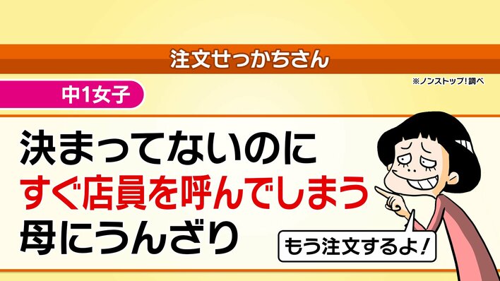 「まだ注文が決まっていないのに店員さんを呼んでしまう」というせっかちな母への苦情の声が紹介されると、千秋さんが「注文の遅いママ友がいると先に店員さんを呼んで、(自分が)オーダーまで決める」とせっかちぶりを披露。