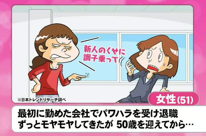 「パワハラで退職したときの上司に対してモヤモヤした気持ちを抱えていたが、50歳になったのを機に、この場にいない人のことで悩むのをやめようと決意した」という、51歳女性のエピソードも登場しました。