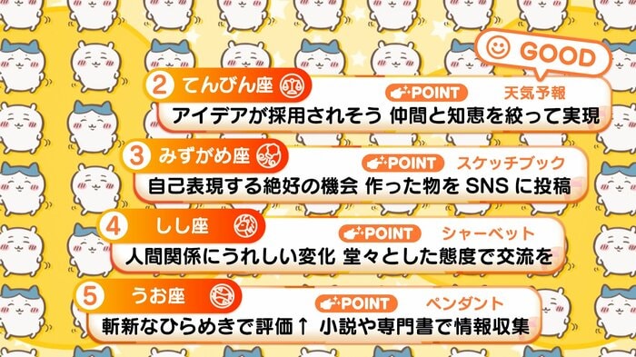 『めざましテレビ』で放送中の「ちいかわ占い」 テレビ放送がない日はお休みで、月~土:朝7時以降に更新予定です。