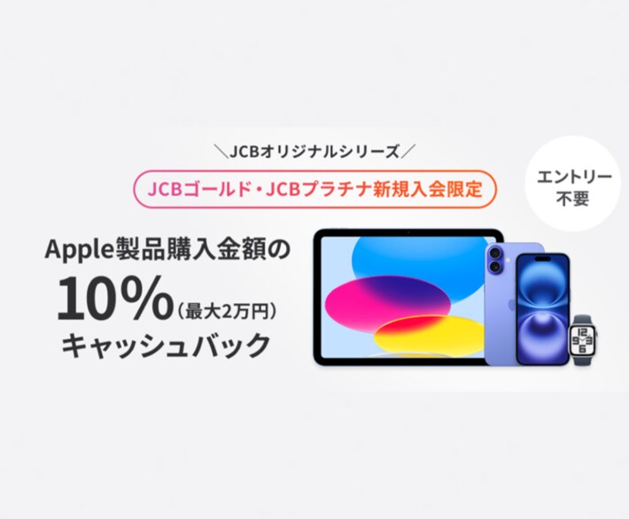 株式会社ジェーシービー (本社:東京都港区、代表取締役会長兼執行役員社長:二重 孝好、以下:JCB)は、2025年9月1日(月)から2026年1月12日(月)の間に、JCBプラチナもしくはJCBゴールドに新規入会されたお客様を対象に、「Apple Storeのお買い物でご利用金額の10%キャッシュバックキャンペーン」を実施します。※キャッシュバックには上限があります。