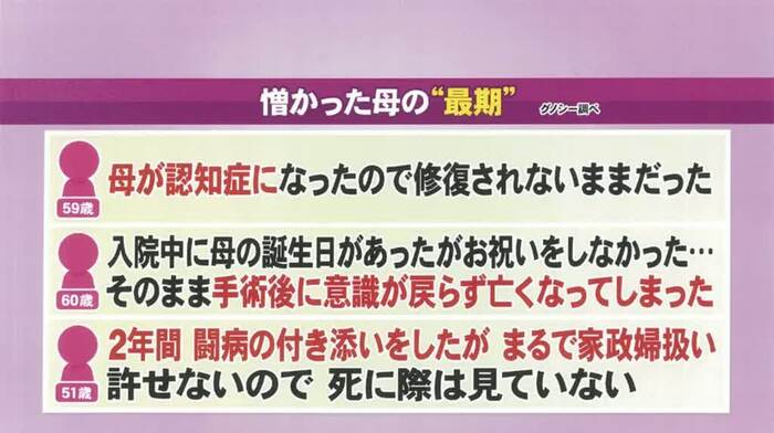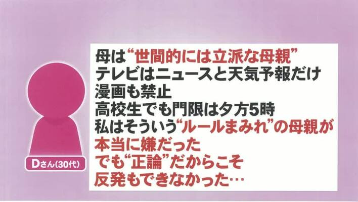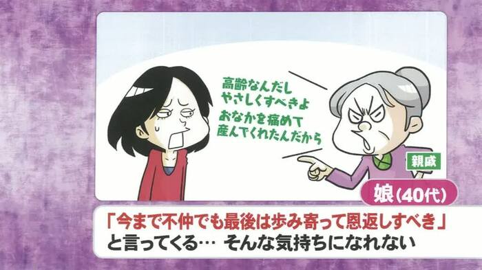 また、「母親に年に1回会うのも苦痛なのに、親孝行しろと周囲から言われるのが辛い」という40代女性からのエピソードが紹介されると、番組公式SNSには「自分は親から大事にされなかったのに、親を大事にしなければいけないのは理不尽」などの共感の声が。