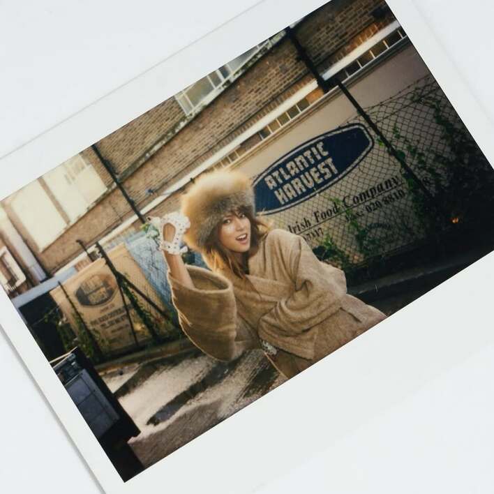 大きなファーキャップをかぶり、ブラウン系の大きめなコートを羽織ったhitomiさん。