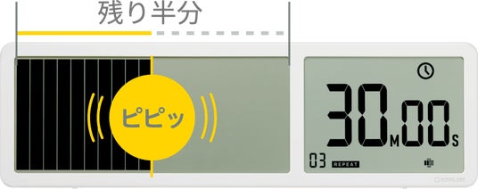 音量は「大・小・消音」の3段階から選択でき、計測時間が半分になると音で知らせる「計測半分通知」機能を新たに搭載しました。付属の「目盛り色分けシール」を使えば、液晶の目盛りを4分割して色分けでき、遠くからでも時間経過をより把握しやすくなります。