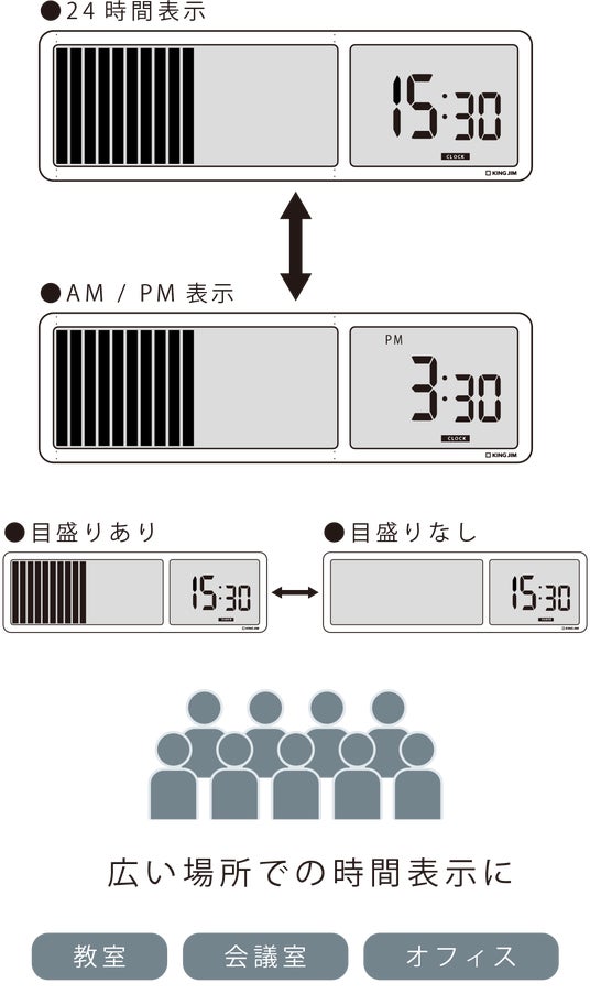 また、従来品は約100分までの計測でしたが、「ビジュアルバータイマー 大型」では約200分までの長時間計測が可能となり、さらに従来品にはなかった「時計モード」を加えた3つのモードを搭載しました。