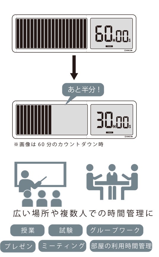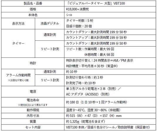 株式会社キングジム(本社:東京都千代田区 代表取締役社長:木村 美代子)は、横方向の大きな目盛りによって残り時間が一目で分かる「ビジュアルバータイマー」シリーズから、大画面モデルとなる「ビジュアルバータイマー 大型」(https://www.kingjim.co.jp/sp/vbt100/)を2025年9月26日(金)より発売します。