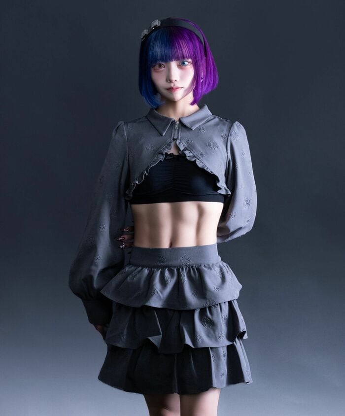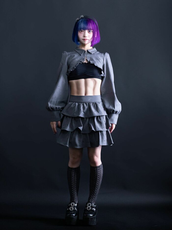 ショート丈のグレーのトップスにグレーの三段フリルのスカート姿、オッドアイの瞳でカメラを見つめる星空さん。