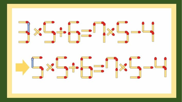 「3×5+6=7×5-4」。この式のマッチ棒を1本だけ動かして正しい式にしてください。