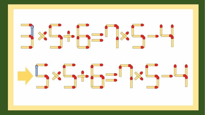 正解はまず、左の式の「3」の縦になったマッチ棒を1本取り、左にズラして「5」にします。そうすれば「5×5+6=7×5-4」となり、正しい式なりました。