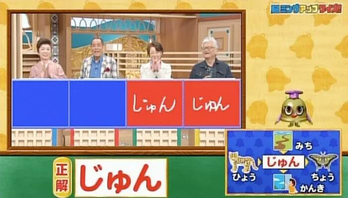 正解は「じゅん(道順・順調・循環器・標準)」。黒田さん、和田さんが正解!