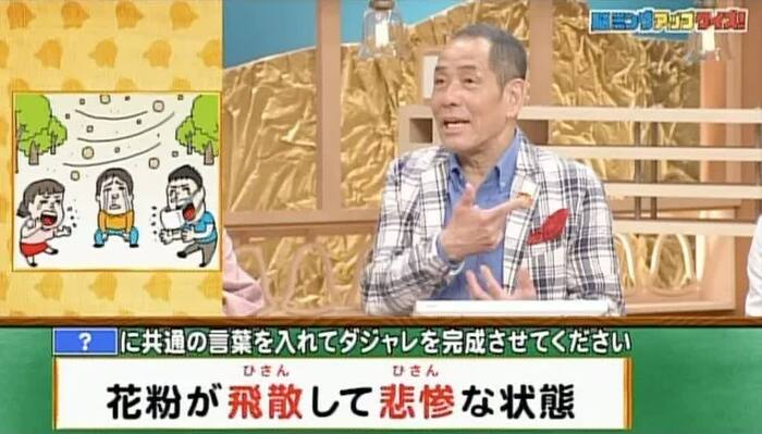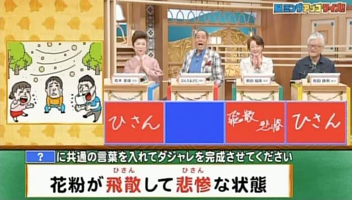 正解は「ひさん(花粉が飛散して悲惨な状態)」。おさむ師匠以外、見事正解!
