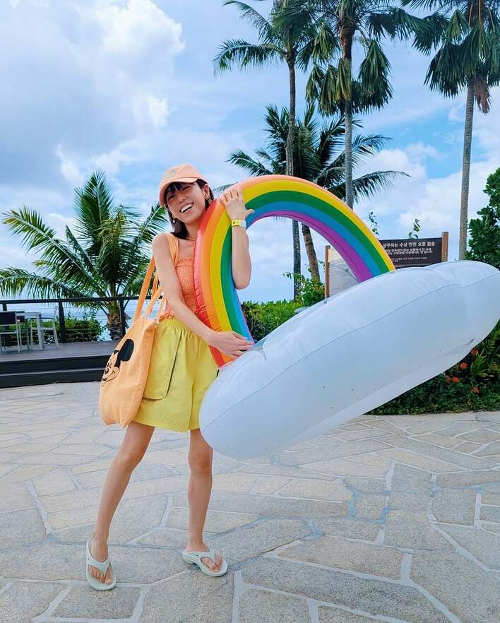常夏感満載のオレンジと黄色のビタミンカラー際立つ水着姿の若槻さんは、白い雲に虹が架かったようなデザインの大きな浮輪を持ち、白い歯をのぞかせてにっこりと笑顔を見せています。