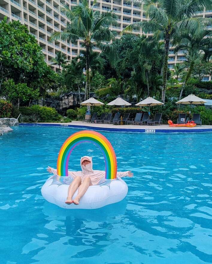 空高く伸びたヤシの木が生い茂るプールで、浮輪にお尻を入れてぷかぷかと水に浮かんでいるショットも。
