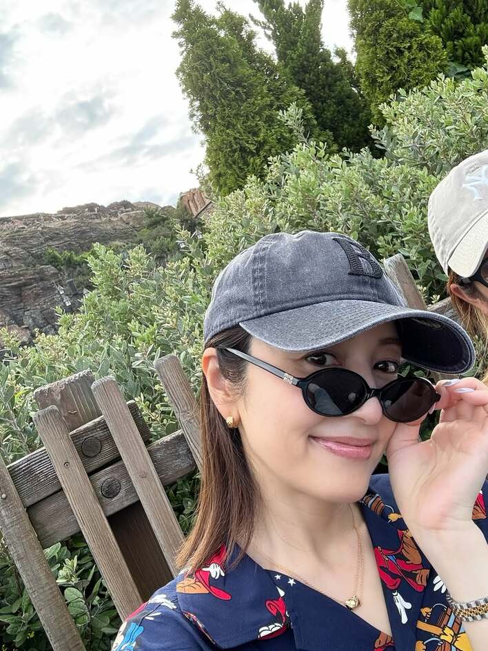 買い物を楽しんでいる最中なのか、ミッキーの耳をモチーフにしたような黒い帽子をかぶり、柔らかくほほ笑んだ自撮りショットも披露。