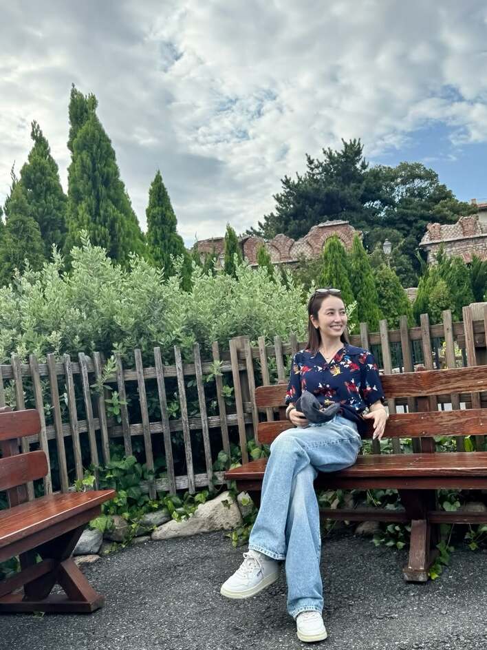 数年前の夏に購入したというミッキー柄がプリントされたネイビーのアロハシャツに、デニムパンツを合わせたスタイルで、木製のベンチに腰を掛けた姿を披露しました。