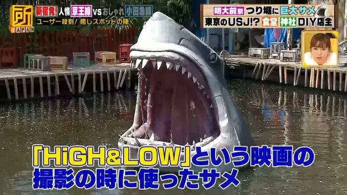 釣り堀にある巨大なサメのオブジェは、映画「HiGH&LOW」の撮影に使われたもの。