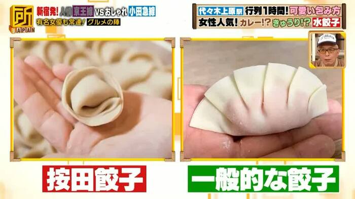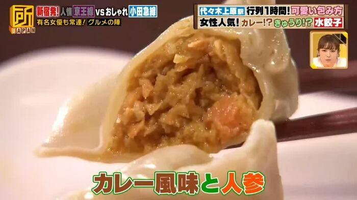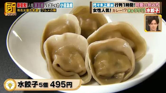 スタッフが向かうと、店前には1時間も並ぶ行列が。この店の名物は、独特の包み方がされた「水餃子」。5個で495円。
